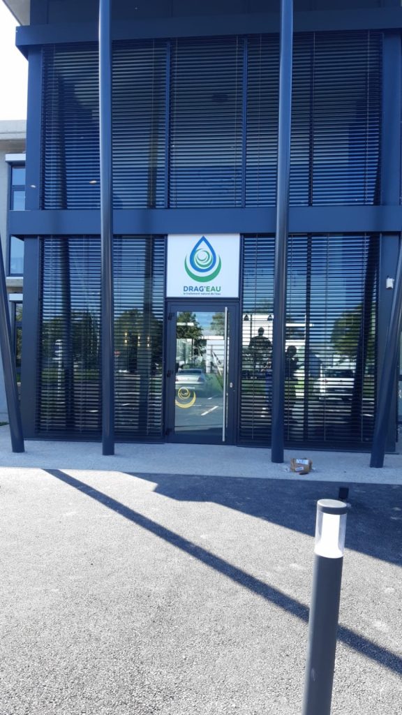 Réalisation d'une façade aluminium vitrée avec porte d'entrée à un vantail et mur rideau pour le site DRAG'EAU à Eguisheim.