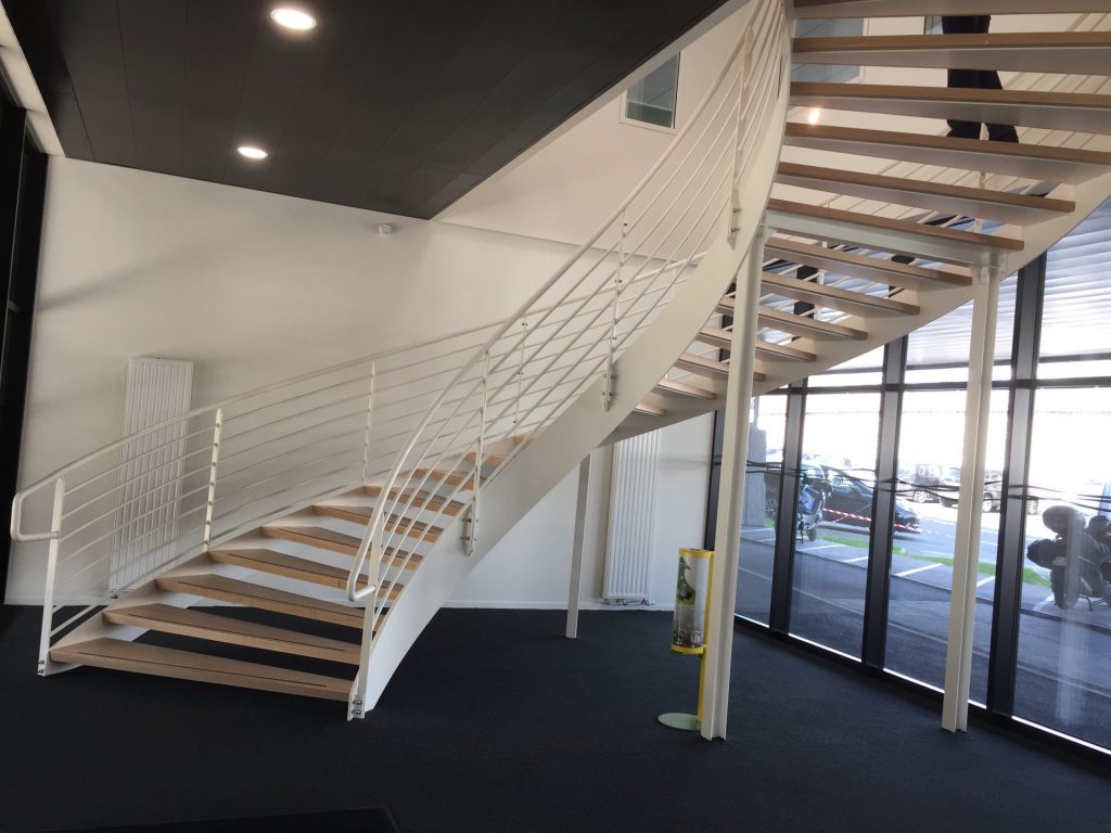 Ce chantier comprend la réalisation de garde-corps intérieurs thermolaqués avec lisse et remplissage en tôle perforée, ainsi qu’une main courante en tube thermolaqué. Un escalier quart tournant thermolaqué a également été installé, équipé de garde-corps avec lisse et sous lisse et de marches en bois.